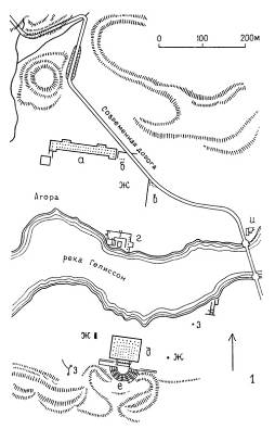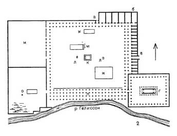2 – схематический план агоры: а – портик Филиппа; б – здание городских властей; в – Мирополис; г – святилище Зевса Сотера; д – Ферсилион; е – театр; ж – алтари; з – источники; и – жилой дом римского времени; к – эдикула; л – базы статуй; м – Героон; н – гимнасий; о – святилище великих богинь; п – колоннада Аристандрия