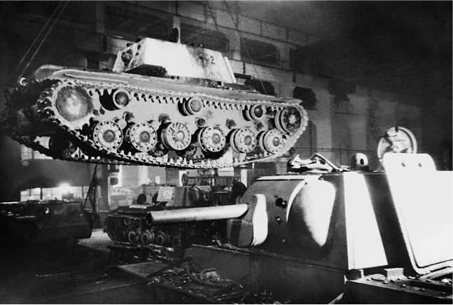 Сборка танков и ремонт танков КВ-1 на заводе № 371 имени Сталина. 1942 год. Машина, поднятая краном, имеет упрощенную башню, пять опорных катков с внутренней амортизацией ленинградского выпуска, один — цельнолитой, доставленный из Челябинска (АСКМ).