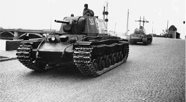Изготовленные на заводе № 371 имени Сталина танки КВ-1 на набережной Невы. Ленинград, октябрь 1942 года. Передняя машина с надписью на башне «За Сталина» имеет упрощенную башню с пушкой Ф-32 и цельнолитые опорные катки, доставленные из Челябинска (РГАКФД).