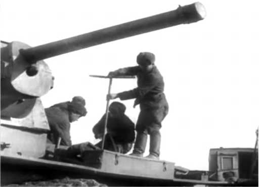 Ремонт танка КВ-1, изготовленного на заводе № 371. 1943 год. Обратите внимание на нестандартную маску пушки ЗИС-5 и ящик ЗИП на левом борту машины (кадр кинохроники).