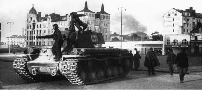 Один из изготовленных на заводе № 371 танков КВ-1 в Выборге. Лето 1944 года. Машина имеет сварную «ленинградскую» башню, изготовленную Ижорским заводом, но вооружена пушкой ЗИС-5. Опорные катки двух типов — усиленные «ленинградские» с внутренней амортизацией и литые «челябинские» (РГАКФД).