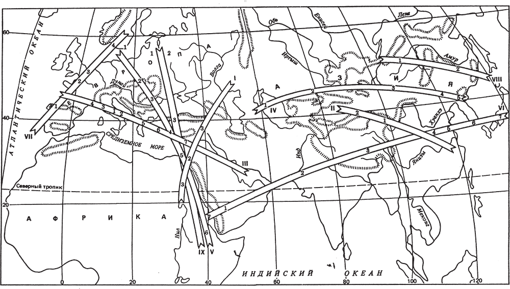 Зоны пассионарных толчков – это узкие полосы, шириной около 300 км при широтном направлении и несколько больше при меридиональном, примерно на 0,5 окружности планеты. Они похожи на геодезические линии[53]. Возникают толчки редко – два или три за тысячу лет, и почти никогда не проходят по одному и тому же месту. Так, за тысячу лет до н. э. отчетливо прослежены два толчка: в VIII в. – от Аквитании, через Лациум, Элладу, Киликию, Парс до Индии, и в III в. – по степям современной Монголии и Казахстана.