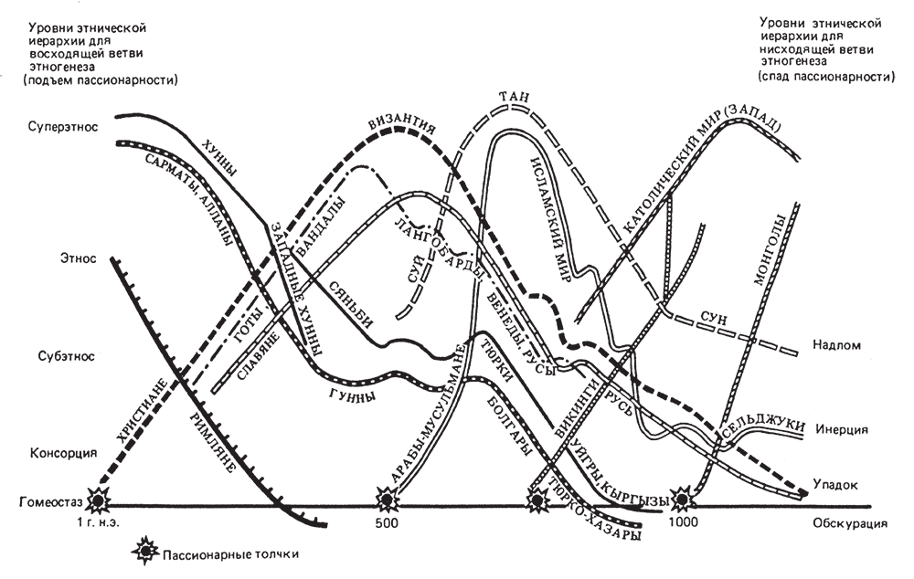 Во всех исторических процессах от микрокосмоса (жизнь одной особи) до макрокосмоса (развитие человека в целом) общественная и природные формы движения соприсутствуют подчас столь причудливо, что иногда трудно уловить характер связи. Это особенно относится к мезокосму, где лежит феномен развивающегося этноса, т. е. этногенез, понимаемый нами как процесс становления этноса от момента возникновения до исчезновения или перехода в состояние гомеостаза.