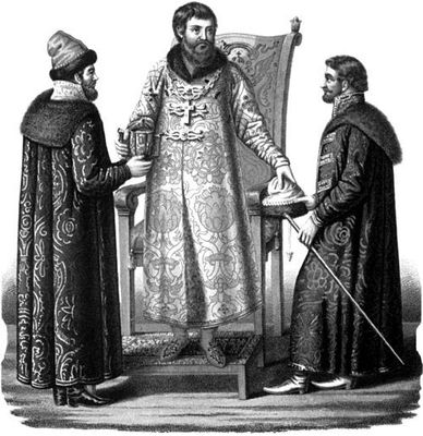 Одежда царская и боярская. В центре Алексей Михайлович, слева — князь Михаил Долгоруков, справа — князь Иван Воротынский.