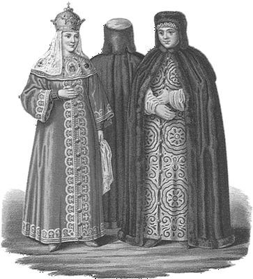 Одежда цариц. Царица Евдокия в царском одеянии и царица Наталья в «ездовом» платье.