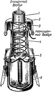 Поступающий в цилиндр воздух проходит через сетку 2 и набивку, разбиваясь там на мелкие струи и оставляя на набивке частицы пыли.