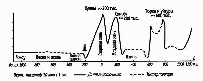 Вполне понятно, что за период постоянных смен правлений, сопровождаемых кровопролитиями, переписи населения не проводились. Следующая цифра, столь же неточная, падает на 589 г. – 11 млн человек[954], из которых 1,5 млн в Южном Китае. При этом надо учесть, что в течение 30 лет население интенсивно росло. Следовательно, в наиболее тяжелое двадцатилетие – с 534 по 554 г. – численность населения Китая упала еще ниже, нежели после Троецарствия, а последующий подъем произошел к 606 г., когда она поднялась до 46 млн[955] – это опять-таки результат естественного прироста, характерного для земледельческих стран с мягким климатом.