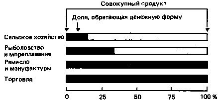 Промышленность и торговля подталкивают денежную экономику к расширению. Образуя громадное большинство в деловой активности городов, они объясняют длительное превосходство последних над территориальными государствами. (По данным К. Гламанна.)
