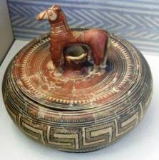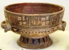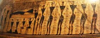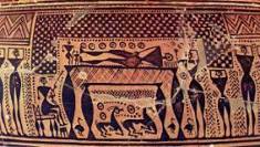 Роспись керамики геометрического периода 9-8 вв. до н. э. отражает, видимо, символику погребального инвентаря – фигурки и рисунки лошадей и почти всюду присутствующие свастики (с вращением как "по солнцу", так и "против солнца").