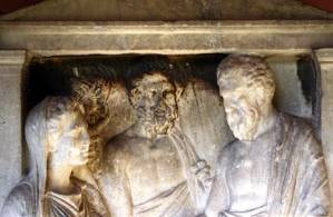 Могила Эвколинея – скорее всего, посвящена встрече в загробном мире умершей девочки. На рельефе ее ласково приветствует Персефона. В руках у девочки – ритуальная лента, а у ног – возможно – элевсинские метелки. Левой рукой девочка протягивает богине птичку (символ души). Или же получает ее от богини.