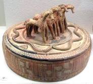 Наконец, некоторые сосуды округлой формы с извлеченным из него нарочито угловатым фрагментом также могли иметь все то же значение: связи с культом Диониса и первоначалом Мирового яйца. Хотя они и считаются моделями зернохранилищ и вазами, не исключено, что они имели ритуальное значение – в них не только можно было ставить цветы, но они также могли быть упрощенными вариантами формискоса – простейшей погремушкой.