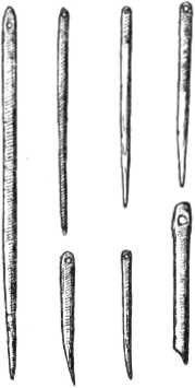 Еще заметнее становятся разнообразие, специализация и более тщательная отделка орудий в следующую эпоху, в эпоху верхнего палеолита. В эту эпоху человек уже научился путем надавливания особыми отжимниками на каменные пластины, или, как говорят в науке, путем отжимания, изготовлять самые разнообразные орудия из камня, кости и рога. В эту эпоху появляются и ножи, и сверла, и резцы, и наконечники, и иглы (см. рис.) и многие другие орудия.