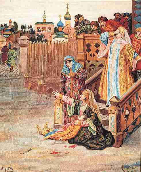 Царица вообще зорко смотрела за сыном, не отпускала его от себя, особенно стала беречь его от подозрительных для нее Битяговских с их товарищами, но 15 мая она замешкалась почему-то в хоромах, и мамка Волохова, участница заговора, повела царевича гулять на двор, за ней пошла кормилица. На крыльце убийцы уже поджидали свою жертву. Сын мамки, Осип Волохов, подошел к царевичу.
