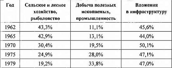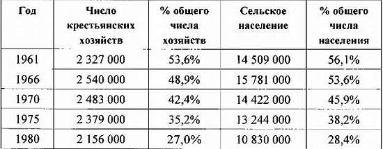 Как следует из Таблицы 13, доля крестьянских хозяйств в общем числе семей сократилась с 53,6 % в 1961 г. до 27 % в 1980 г., а доля крестьянства в общей численности населения страны уменьшилась с 56,1 % до 28,4 %. Сократилось и число занятых в сельском хозяйстве: с 63,1 % в 1963 г. до 45,9 %— в 1975 г., в то время как процент занятых в добыче полезных ископаемых и промышленности вырос с 8,7 % до 19,2 %.