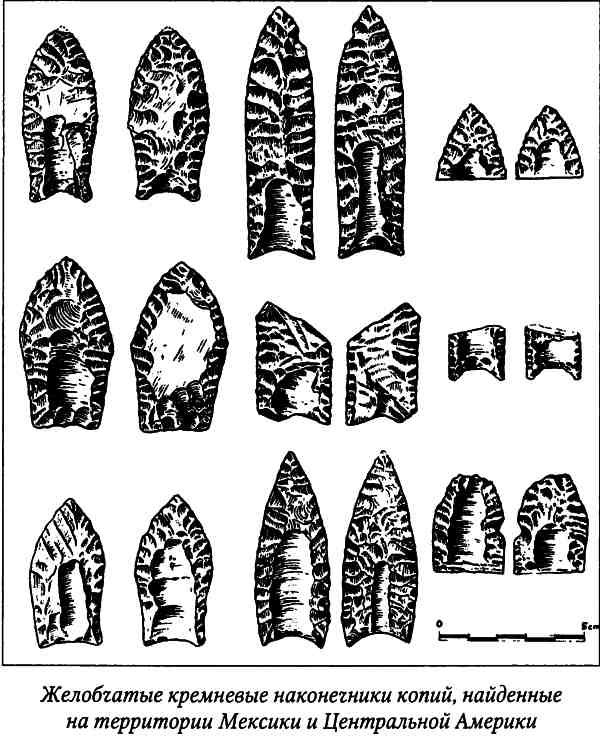 Археологические открытия последних лет на территории Мексики показывают, что тепешпанский человек отнюдь не был первым обитателем этих мест. И хотя мы сейчас не знаем точно, когда именно первобытные охотники и собиратели впервые достигли долины Мехико, не приходится сомневаться, что это случилось не позднее чем 21–22 тыс. лет назад. Во всяком случае, именно так датируется палеоиндейская стоянка в Тлапакойе (на окраине современного г. Мехико) с помощью целой серии радиоуглеродных анализов1. А ведь есть ещё и остатки ископаемых гигантских животных ледниковой эпохи, найденные вместе с каменными орудиями, сделанными рукой человека, в Вальсекильо (штат Пуэбла, Центральная Мексика). Судя по геологической периодизации, этой находке около 20 тыс. лет, а по данным радиоуглеродного анализа 21–23 тыс. лет.
