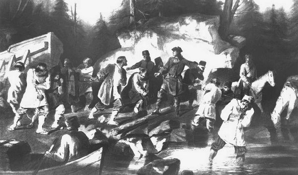 В. Суриков. Петр I перетаскивает суда из Онежского залива в Онежское озеро в 1702 году. 1872 год