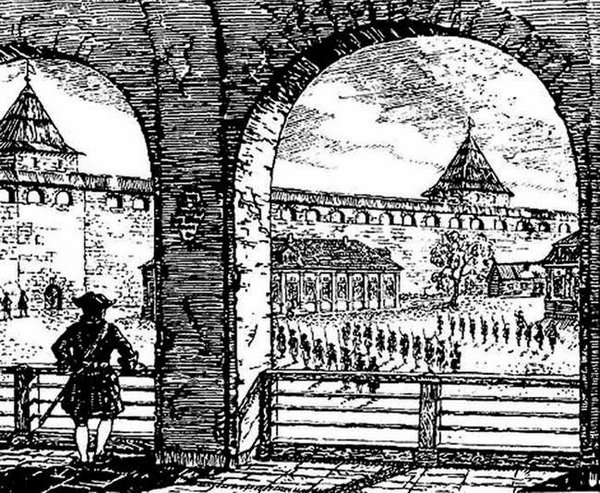 Вид с галереи на крепостной плац и дворец Петра I. XVIII век