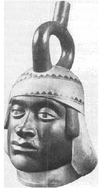 Уже эти данные позволяют предполагать, что общество мочика как социальная и политическая структура было достаточно сложным образованием. Судя по имеющимся данным, культовая и бытовая обособленность отдельных социальных групп в обществе мочика достигла весьма высоких ступеней. Об отражении этих процессов в погребальных обрядах можно судить по захоронению, получившему наименование погребения «воина- жреца», обнаруженному около пирамиды на поселении в долине р. Виру, одном из локальных подразделений мочикской общности. Здесь в могильной яме располагался сделанный из тростника гроб с останками мужчины преклонного возраста. Рядом в скорченном положении находились две женщины, как бы втиснутые в могилу, поверх гроба лежал скелет взрослого мужчины и у его ног мальчик. По-видимому, это были сопровождающие погребения, куда помещались лица, возможно даже насильственно умерщвленные. Уже одно это подчеркивало неординарный статус основного погребения. Это же подтверждает характер погребальных приношений и сопровождающего инвентаря. В могильной яме были обнаружены две обезглавленные ламы, 25 сосудов, ткани, изделия из меди (иногда со следами позолоты), камней и дерева. Особо эффектны резные инкрустированные жезл, палица и землекопалка, увенчанная скульптурой, изображающей антропоморфное божество с мальчиком у его ног. Естественно напрашивается аналогия между этим парным изображением и помещением в гробницу мальчика. Скорее всего, неординарный жизненный статус мужчины преклонных лет определялся в числе прочих аспектов и осуществлением каких-то обрядовых функций, возможно связанных с культом плодородия. Видимо, это был представитель социальной группы, занимавшей высокое положение в обществе. Престижные и церемониальные объекты как атрибуты соответственной социальной аранжировки хорошо известны по находкам, и среди них, как уже упоминалось, имеется даже золотая копьеметалка. Иконография свидетельствует, что существовала определенная регламентация и в одежде, во всяком случае в головных уборах.