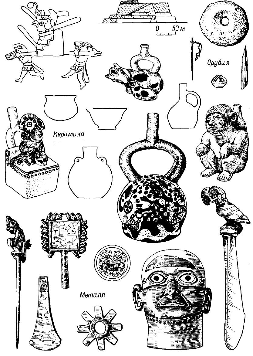 Конец мочика характерен для судеб многих высокоразвитых культур поры формирования первых цивилизаций. Постепенно, как свидетельствуют памятники культуры, территория, подвергающаяся прямому воздействию мочикских эталонов, сокращается, на многих городищах накануне полного запустения появляются следы пожарищ. Видимо, общество мочика, уделявшее в иконографии столь значительное внимание батальным сценам, само оказалось в числе побежденных. Не исключено, что этому способствовали и природные факторы, в частности сокращение количества осадков, губительно сказавшееся на мочикском орошаемом земледелии (Березкин, 1983а, с. 28— 29). Однако мочикская традиция не прерывается. Цивилизация как сложное социально-культурное образование продолжает существовать в Южной Америке, хотя уровень ее достижений и меняется во времени, так же как и этнический облик конкретных носителей. Собственно же мочикский культурный пласт органически вошел в культуру государства Чимор, бывшего одно время опасным соперником инков в борьбе за региональную гегемонию. Его столица Чан-Чан практически не уступает мезоамериканскому городскому гиганту — Теотехуакану. В Чан-Чане, кстати, располагались, видимо, и «царские» гробницы. Вещи из них давно расхищены, но сохранились сотни женских скелетов — следы безжалостного обычая человеческих жертвоприношений, сопровождающего становление единоличной власти царей от Шумера до иньского Китая.