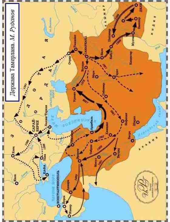 Тимур держал при себе в качестве номинальных монархов ханов царской крови, сам же произвел себя из эмиров в «великие эмиры». В течение тридцати пяти лет Железный Хромец выковывал свою державу, размеры которой в конце концов почти сравнялись с империей Чингисхана. Тамерлан завоевал Хорезм, Персию, Афганистан, Малую Азию, Индию и только смерть помешает ему присоединить Китай.