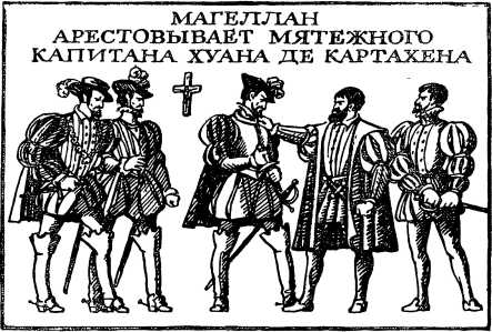 Магеллан промолчал. Да, не так-то просто будет совладать с этим вельможей и другими знатными грандами, участниками его экспедиции. Но он ведь знал, на что шел. Он выжидает, и никто не догадывается, что ему все известно о заговоре. Он ждет своего часа, и, когда этот час настал, он во время совета в своей каюте вызывает Картахену на ссору и неожиданно, на глазах у всех, объявляет его арестованным.
