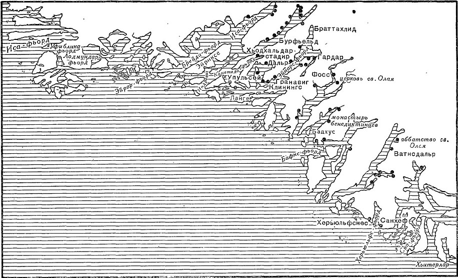 Рис. 2. Карта юго-западной оконечности Гренландии с древними норманскими поселениями. См. R. Cronau, America, Leipzig, 1892, В. I. Черные кружки — руины древних норманских поселений. [80]