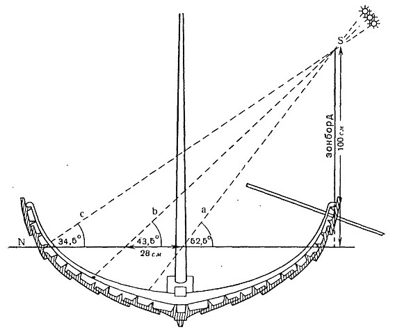 Астрономические данные, приведенные Халдором, также можно расценить как проявление похвального стремления к максимальной научной точности. Однако эти данные очень примитивны и совершенно недостаточны для точного определения географической широты, на которую они указывают. Рейтер пытался расшифровать астрономические данные, сообщенные в «Хауксбоке», с учетом методов определения высоты солнца, применявшихся норманскими мореплавателями. Сделанный им чертеж (см. рис. 3) наглядно показывает применение для этой цели «зонборда», то есть особого стержня, устанавливавшегося в вертикальном положении на борту корабля. На основании своих вычислений Рейтер приходит к выводу, что мореплаватели 1267 г., видимо, прошли вдоль западного побережья Гренландии до 74,5° с.ш. Эту широту [83] мы можем теперь считать наиболее вероятной. Следовательно, отважные моряки действительно зашли даже несколько севернее залива Мелвилл, который Нансен считал конечным местом их плавания.
