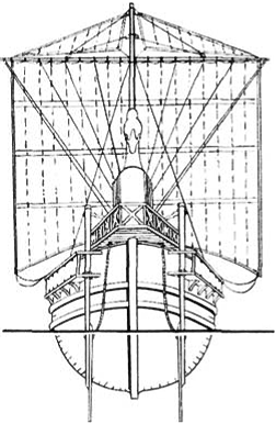 На выступающих кормовых балконах — кринолинах — крепилась пара мощных рулевых весел. На римских зерновозах впервые появилось надпалубное помещение — прообраз мостика. Там располагались хозяин и пассажиры.