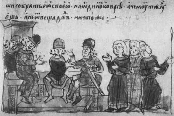 Поход русских князей на половцев 1103 года. Олег Черниговский отказывается от приглашения Владимира Мономаха и Святополка Изяславича. Миниатюра Радзивиловской летописи