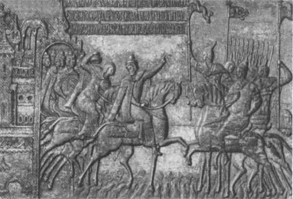 Император Константин передаёт послам Животворящий Крест и царский венец («шапку Мономаха»)