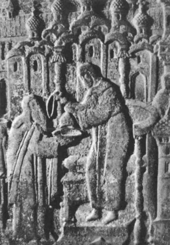 Митрополит Неофит венчает великого князя Владимира Мономаха царским венцом. Барельефы «Царского места» Успенского собора