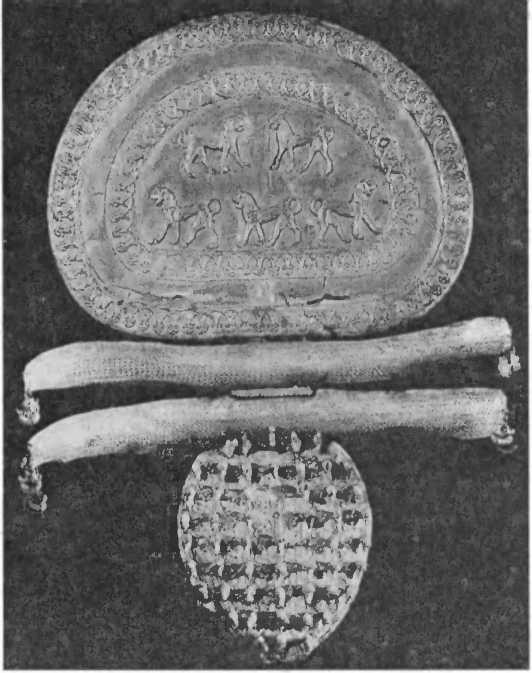 Те же верования о существовании у покойных потребности во всем том, что им было необходимо при жизни, определили и состав погребального инвентаря. Покойников наряжали в их лучшие одежды, мужчин снабжали оружием, женщин — украшениями. Разнообразие и богатство их зависело от общественного положения покойного. В гробнице, раскопанной близ Черветери епископом Реголини и генералом Галасси в 1836 г., имелась узкая погребальная камера, частично вырезанная в туфе. Там на каменном катафалке покоилась женщина, имя которой, судя по надписям на серебряных сосудах, — Лартия. Как и во многих других камерных гробницах Этрурии, справа и слева в стенах были вырезаны ниши. У входа в правую нишу находилось погребение воина в глиняной урне. О том, что это был воин, можно судить по погребальному инвентарю — восьми великолепным щитам. Здесь же имелось другое захоронение с обрядом трупоположения, сопровождаемое исключительно богатым инвентарем. Кто был этот человек, мужем или сыном Лартии, трудно сказать. В гробнице имелись две повозки, на которых, видимо, покойники были доставлены к месту захоронения. Одна из повозок находилась в центре погребальной камеры. Ее украшенное львиной головой дышло было обращено в сторону входа.