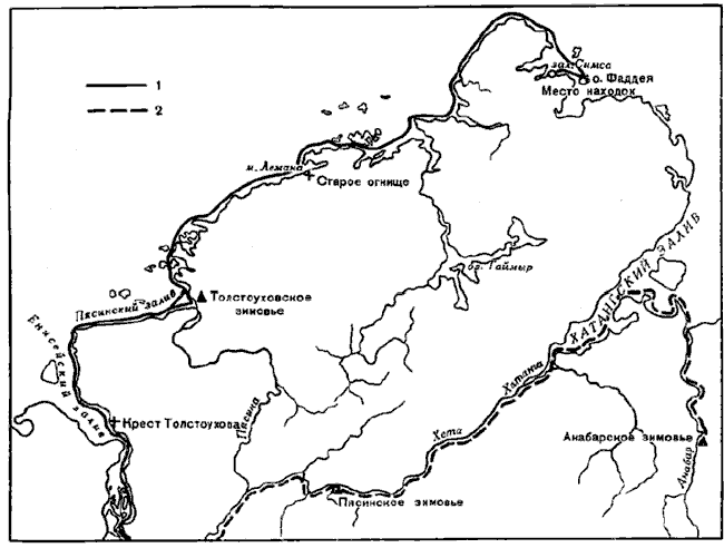 1 — предположительный маршрут экспедиции Толстоухова, 2 — речной и морской путь с Енисея на Анабар.