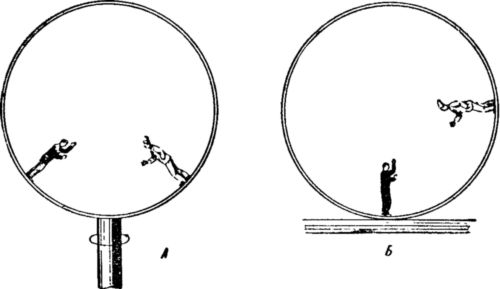 Еще более сильное ощущение можно испытать в непрозрачном вращающемся шаре. Предположим, что в нем находятся два человека, как изображено на рис. 25, А.