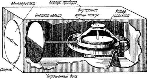 Диск авиагоризонта насажен на удлиненную ось, идущую от внутреннего кольца гироскопа. Внутри этого кольца расположен вертикально ротор гироскопа, вращающийся со скоростью свыше десяти тысяч оборотов в минуту. Весит ротор всего около четырехсот граммов. Приводится он во вращение струей воздуха, падающей на лункообразные углубления, имеющиеся по окружности ротора. Внешнее кольцо гироскопа покоится в подшипниках корпуса прибора.