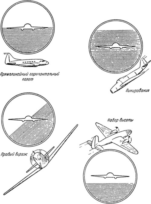 Рис. 29. Различные положения самолета и показания авиагоризонта.