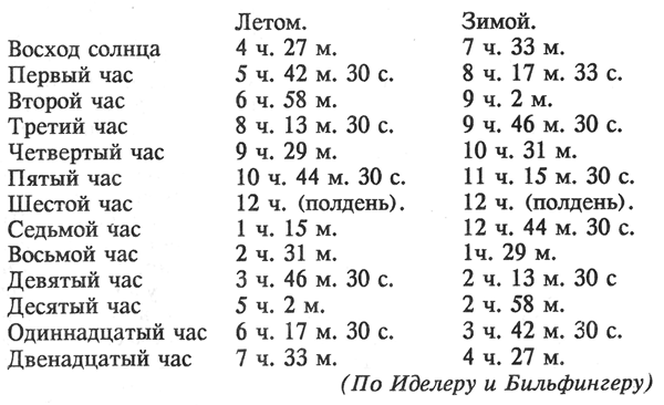 Для того, чтобы свободнее говорить о бытовом расписании римского дня, полезно будет прежде всего усвоить его часовое деление, которое отличалось от нашего, так как общеупотребительный счет времени начинался не от полуночи и полудня, но от солнечного восхода, что делало его разным для лета и зимы. Двадцатичетырехчасовое деление суток применялось только учеными, в научных трудах.