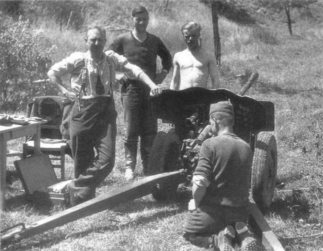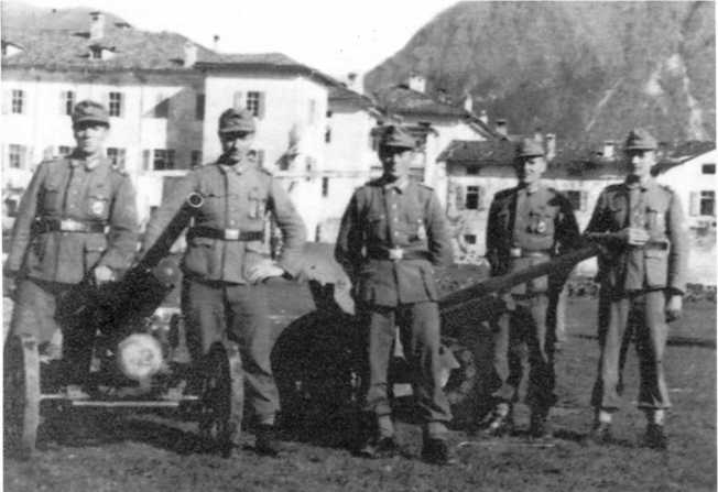 Солдаты одной из полицейских частей у своих орудий: 47-мм противотанкового итальянского Pak 177 (i) (слева) и 45-мм советского Pak 184 (r). Отличие итальянского орудия от его австрийского аналога — отсутствие дульного тормоза.