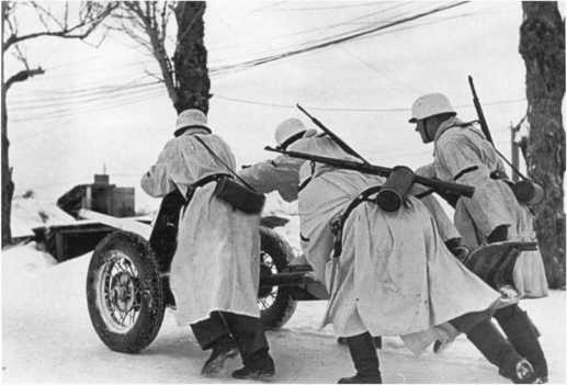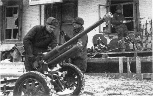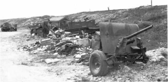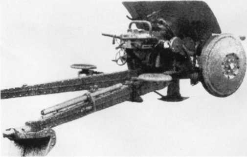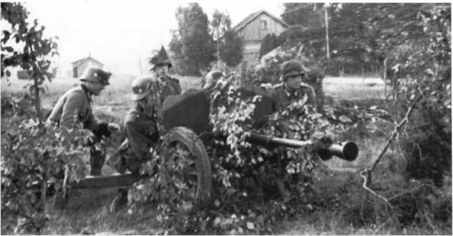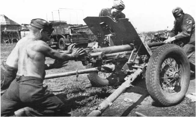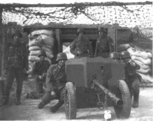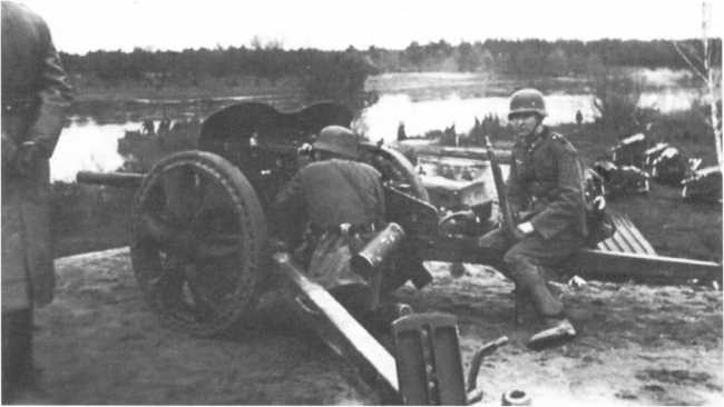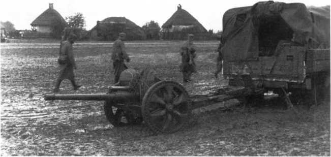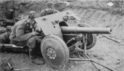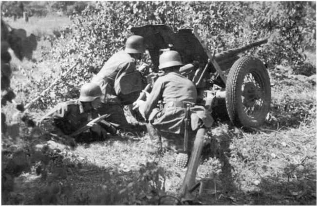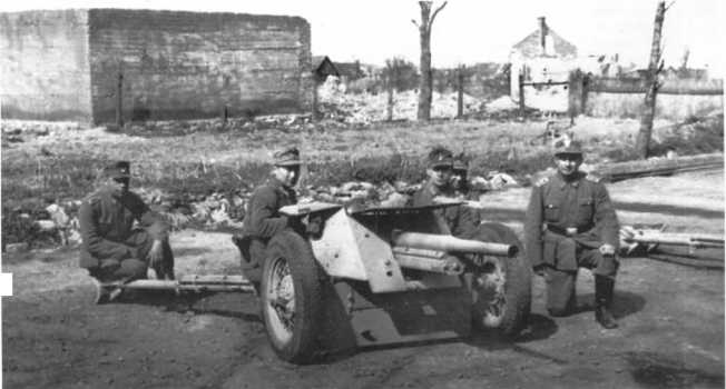 Расчет Pak М 37 (t) на огневом рубеже. В отличие от орудия на фото 72, у этой пушки колеса с пневматическими шинами, что позволяло увеличить скорость ее перевозки при помощи мехтяги (АСКМ).