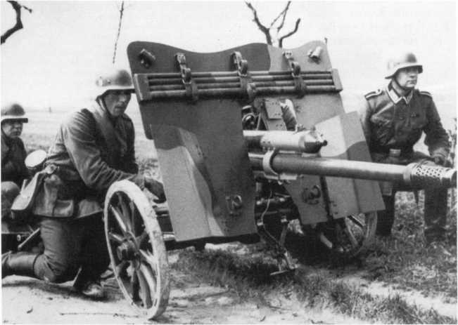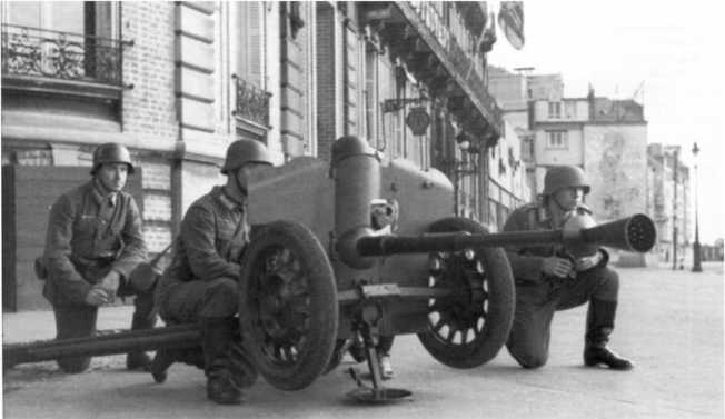 Немецкий расчет у 25-мм противотанковой пушки Гочкиса образца 1934 года SA-L mle 34. Франция, июнь 1940 года. Небольшое количество таких трофейных орудий использовалось в частях вермахта еще во французской кампании 1940 года (АСКМ).