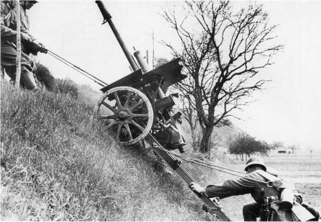 Подъем в гору 47-мм противотанковой пушки Pak 36 (t). Югославия, весна 1940 года. Как и немецкие противотанковые орудия, артсистемы чехословацкого производства имели в своем комплекте специальные тросы, которые облегчали расчету транспортировку пушек по местности вручную (РГАКФД).