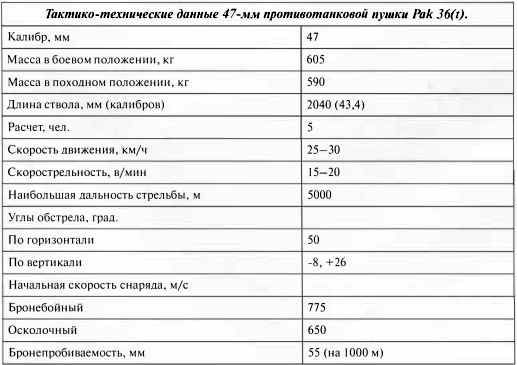 47-мм противотанковая пушка Pak 36(t) по бронепробиваемости лишь немного уступала 50-мм немецкой Pak 38 и использовалась в войсках вплоть до начала 1943 года, после чего ее начали заменять на более мощные 75-мм Pak 40.