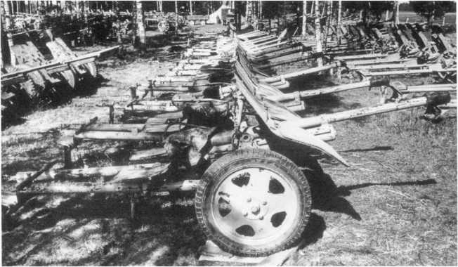 37-мм противотанковые пушки Pak 36 (р) польского производства в немецком артиллерийском парке во время капитуляции группы армий «Курляндия». Май 1945 года. На фото видно не менее 14 таких орудий (АСКМ).