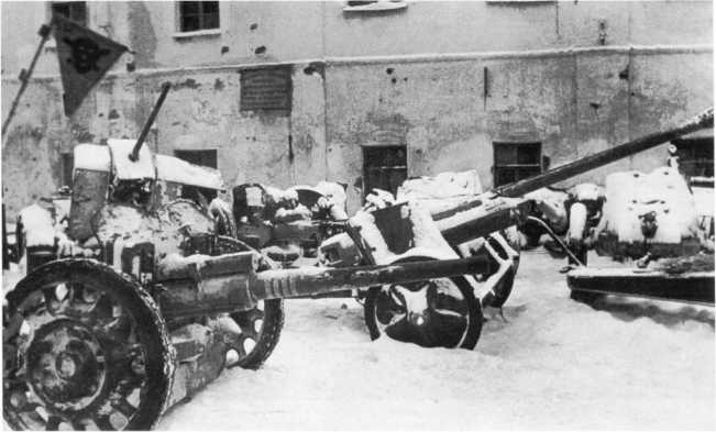 Трофейная артиллерия в освобожденном Тихвине. Декабрь 1941 года. Слева на переднем плане видна 47-мм противотанковая пушка Pak 181 (f) французского производства. На ее стволе 4 белых кольца — число подбитых советских танков. Орудие имеет колеса, отличающиеся от установленных на Pak 181 (f), изображенной на предыдущем фото (АСКМ).