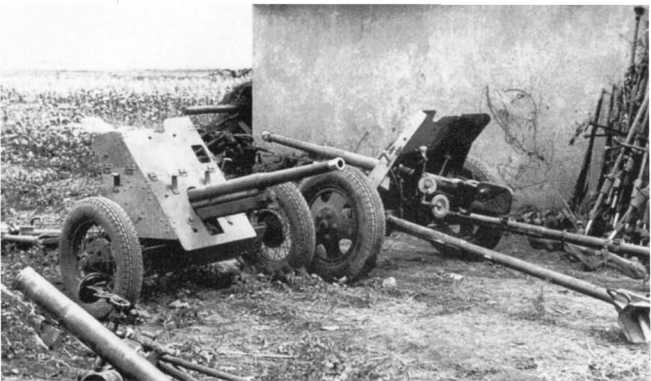 Трофейные советские 45-мм противотанковые пушки образца 1934 и 1937 годов (слева и справа соответственно). Лето 1943 года. В вермахте эти орудия использовались под обозначением Pak 184 (r) (АСКМ).