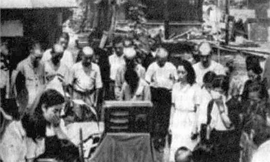 Рис. 57. 15 августа 1945 г. Проживавшие в Корее японцы слушают по радио речь императора Хирохито о безоговорочной капитуляции Японии перед союзниками.