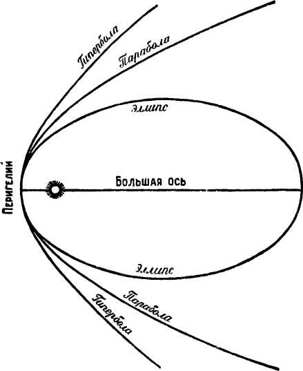 Почему же одни небесные тела двигаются по эллипсам, другие по параболам, а третьи по гиперболам? Это зависит, как показал Ньютон, от той скорости, с которой небесное тело, попав в поле тяготения, движется в нем, от направления этой скорости и расстояния от данного тела до Солнца или другого центра притяжения.