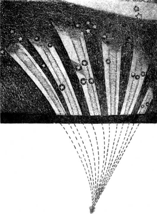 Бредихин на редкость глубоко и детально разработал «фонтанную» теорию. Он вывел ряд новых формул для более точного вычисления орбит частиц, выброшенных из ядра кометы. Ему удалось объяснить такие подробности в строении хвостов, которые до него казались совершенно непонятными. В хвостах второго типа, например, часто можно заметить какие-то поперечные полосы, пересекающие хвост. Что это за полосы?