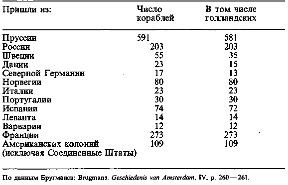 Проделанный французским консулом в Амстердаме в 1786 г. подсчет 1504 кораблей, пришедших в Амстердам. Несмотря на поздний период, эти корабли почти все были голландскими.