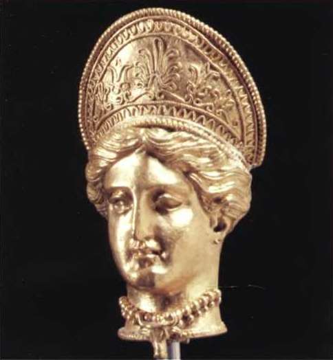 Золота підвіска у вигляді голівки богині Деметри із скифського кургану з Запорізької області. IV ст. до н. е.